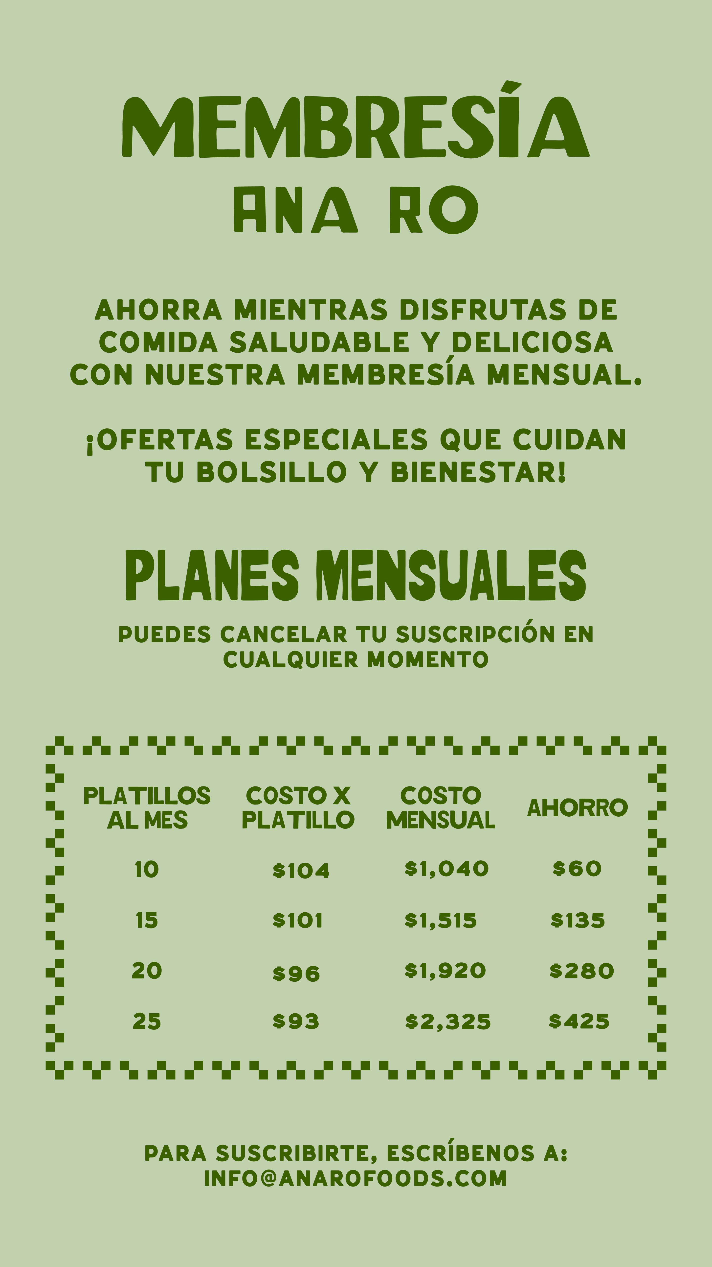 Con tu membresía recibes tus platillos favoritos cada mes a un precio preferencial, y puedes cancelar o ajustar tu plan en cualquier momento. Nuestro objetivo es hacer que llevar una alimentación nutritiva sea sencillo, accesible y sostenible para ti.